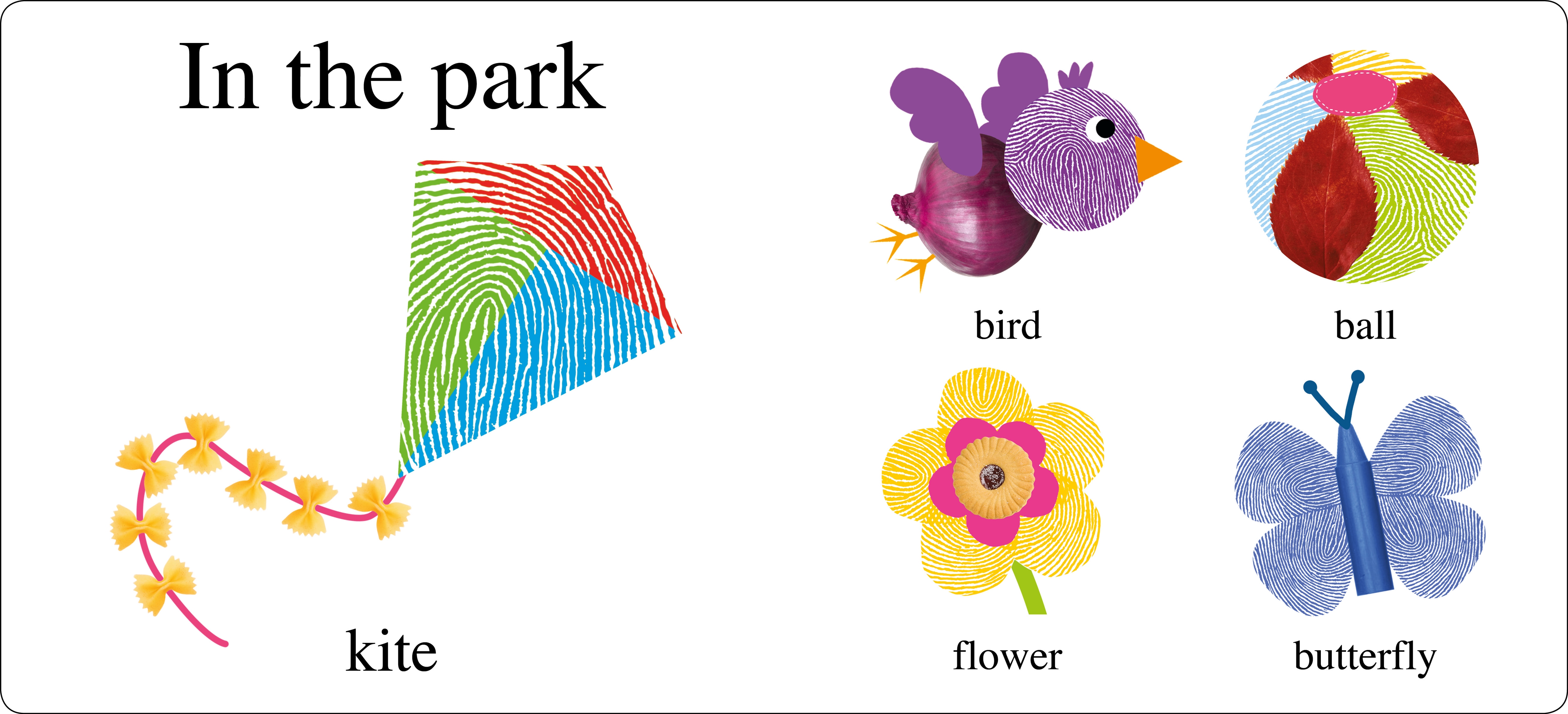 This casebound board book has over 40 first words to learn, accompanied by the quirky Alphaprints animals and objects created using fingerprints and photographs of everyday objects. Each spread is themed―pets, park, vehicles, toys, farm, food, colors and animals―and the fingerprints are embossed for lots of see-touch-feel fun.
