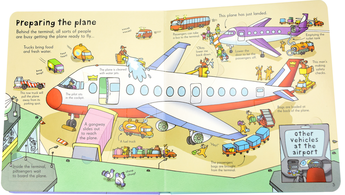 Сцены включают «Обработка багажа», «Подготовка самолета», «Взлет» и «Перевозка груза». Богато информативная и полная сюрпризов, эта книга идеально подходит для маленьких пальчиков и любознательных умов.